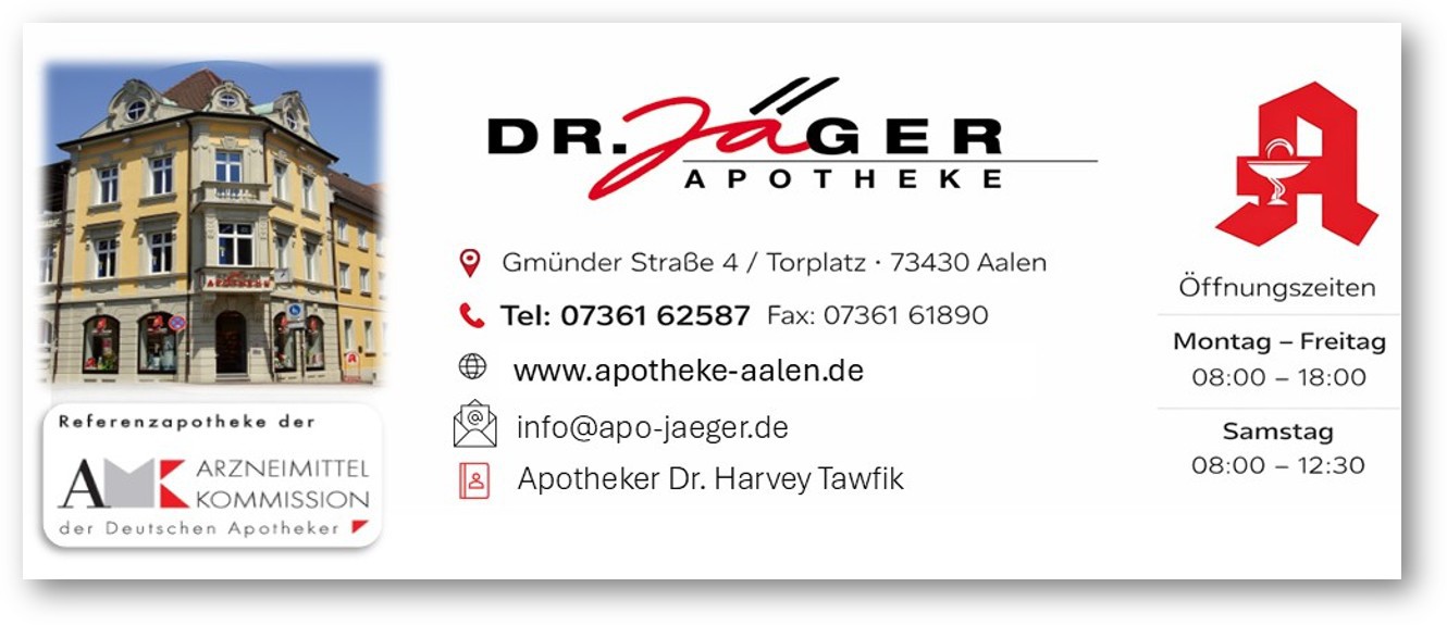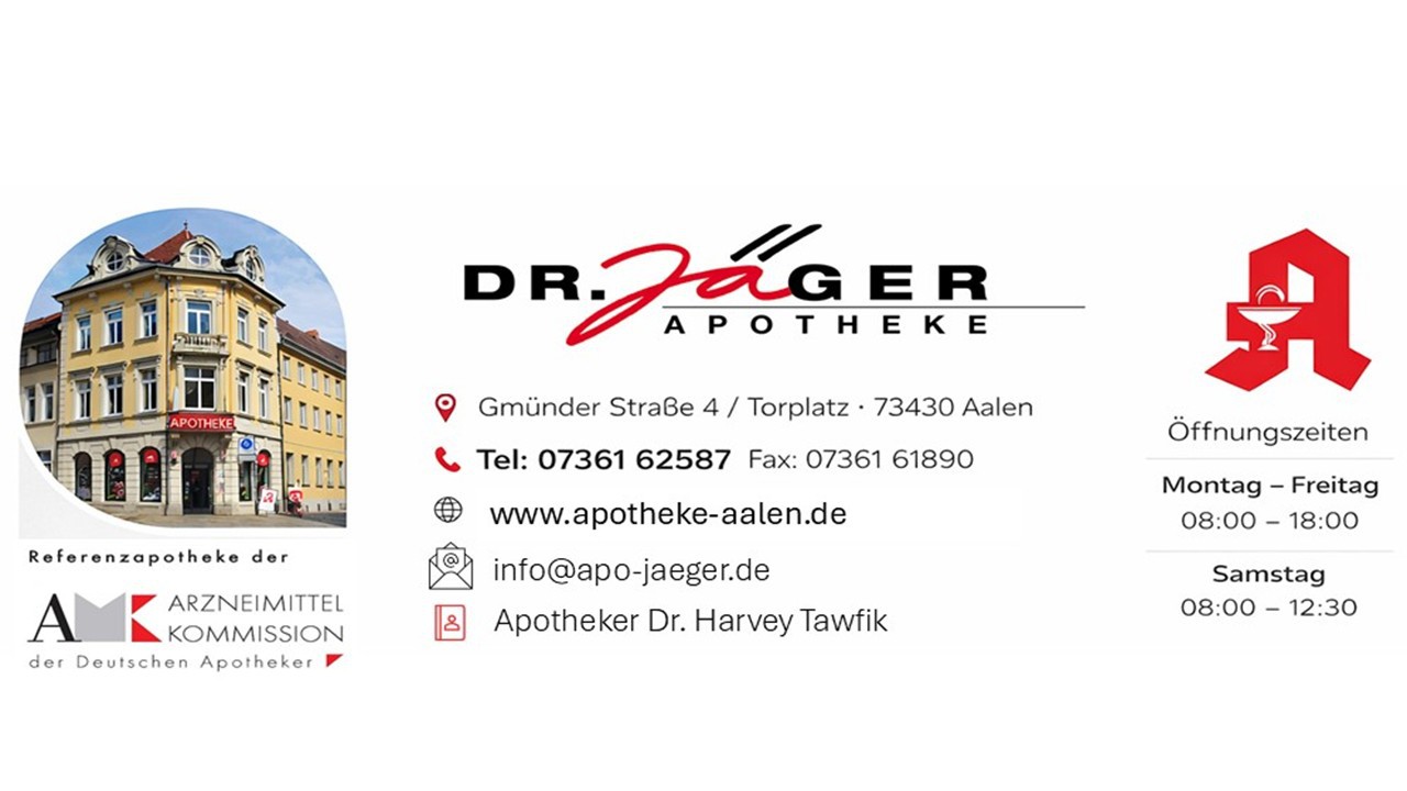 Die Apotheke Dr. Jäger ist die Referenzapotheke der Arzneimittel- kommission der deutschen Apotheker in Aalen. Referenzapotheken kommt eine besondere Verantwortung und hohes Engagement auf dem Gebiet der Kundenberatung, Aus-, Fort- und Weiterbildung zu. Hierfür setzten wir uns konsequent und erfolgreich im Sinne unserer Kunden ein.